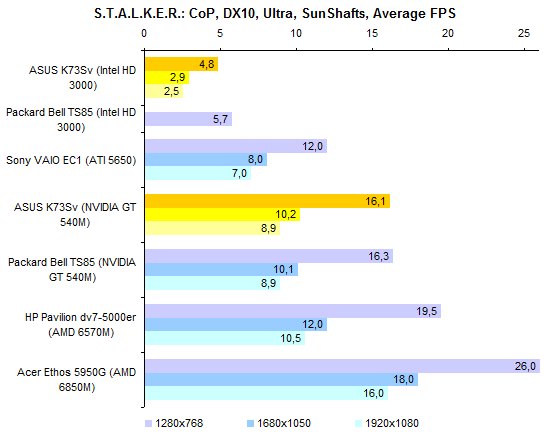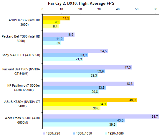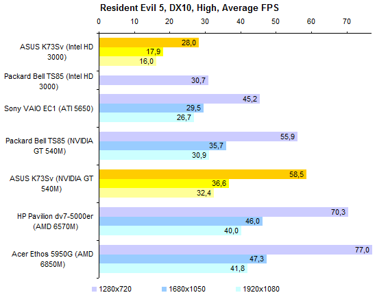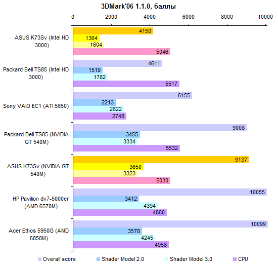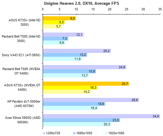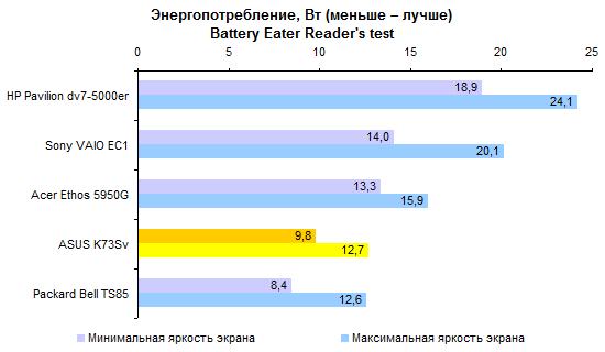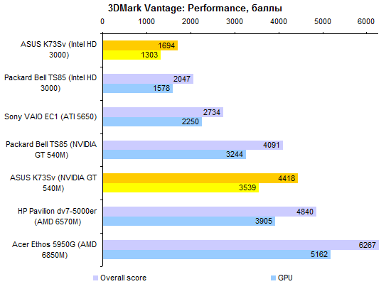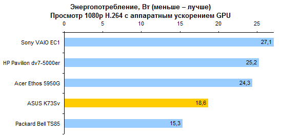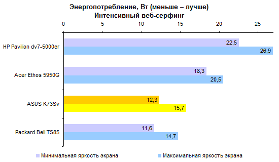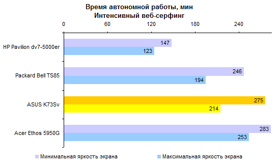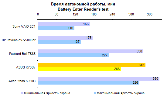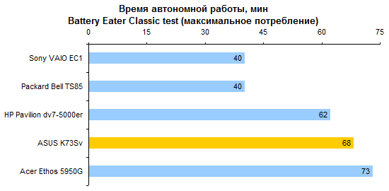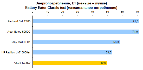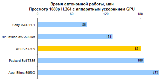 Результаты теста производительности процессора и памяти совершенно ожидаемые. С Core i7-2630QM мы уже встречались дважды. ![]() С тестами графической подсистемы дело обстоит несколько интереснее. Предыдущие протестированные модели с Core i7-2630QM позволяли использовать только внешнюю графику. Так что тест ASUS K73Sv — отличная возможность опробовать замедленную версию Intel HD 3000. Как можно видеть на графиках, в 3DMark’06 и Vantage разница составляет около 10-15%, что довольно много. ![]() Также интересен ответ на вопрос, насколько поднимает производительность GeForce GT 540M повышение частоты графической памяти с 800 до 900 МГц. Синтетические тесты семейства 3DMark и здесь оценивают прирост достаточно оптимистично — в 5-10%. ![]() ![]() Тестовый пакет Unigine Heaven 2.0 и реальные игры не вполне согласны с популярными бенчмарками MadOnion. Разрыв между разными версиями Intel HD 3000 в большинстве случаев еще больше — стабильно 15% с небольшим. То есть результаты отличаются как раз настолько, насколько выше частота графического ядра. ![]() ![]() ![]() ![]() А вот выигрыш GeForce GT 540M от более быстрой памяти почти не заметен — считанные проценты, на которые можно не обращать внимания. ⇡#Тестирование — масса, время автономной работыНоутбук комплектуется стандартным 6-элементным аккумулятором. Установленная в тестовом экземпляре батарея обладает неплохой емкостью — около 56 Вт*ч. Впрочем, не стоит забывать о том, что серия K — недорогая. Так что в розничных K73Sv, весьма вероятно, будут использоваться не такие продвинутые аккумуляторы, тоже 6-элементные, но с емкостью в районе 48 Вт*ч. Все протестированные 3DNews ноутбуки на процессорах Sandy Bridge были оснащены громоздкими 120-ваттными блоками питания. ASUS K73Sv — первый попавший к нам на тест портативный компьютер на новой платформе Intel, который был укомплектован более компактным адаптером мощностью 90 Вт. Конечно, и такой блок питания не назовешь мечтой путешественника, но по сравнению с 600-граммовыми махинами это — верх изящества. А вот сам ноутбук не такой уж легкий. ASUS K73Sv весит примерно на полкило больше, чем предыдущая протестированная 3DNews «четырехъядерная семнашка» — HP Pavilion dv7. Впрочем, если считать вместе с блоками питания, да не забыть, что в ноутбуке ASUS был установлен второй винчестер (масса диска — 115 грамм), то общий результат не так уж плох. В конце концов, для настольной модели масса не столь критична. ![]() После тестирования HP Pavilion dv7, в ходе которого выяснилось, что не все ноутбуки с процессорами Sandy Bridge одинаково экономичны, большой надежды на хорошие результаты ASUS K73Sv не было. В конце концов, это недорогой ноутбук, с не самым емким аккумулятором — вдобавок оснащенный большим экраном и двумя быстрыми винчестерами. Однако конструкторы ASUS преподнесли приятный сюрприз — K73Sv работает от батареи по-настоящему долго. ![]() ![]() Причем не только в режиме чтения (фактически — простоя). Даже если умеренно нагрузить ноутбук работой, результаты остаются достаточно хорошими. К примеру, ASUS K73Sv позволяет 3,5-4,5 часа, в зависимости от уровня подсветки дисплея, бороздить просторы Интернета вдали от розетки. ![]() ![]() Смотреть фильмы высокой четкости с максимальной яркостью можно порядка 3 часов. Правда, при этом не следует забывать включить ускорение GPU (иначе ноутбук проработает на полчаса меньше), а также проследить за тем, чтобы система NVIDIA Optimus не переключалась на внешнюю графику (после