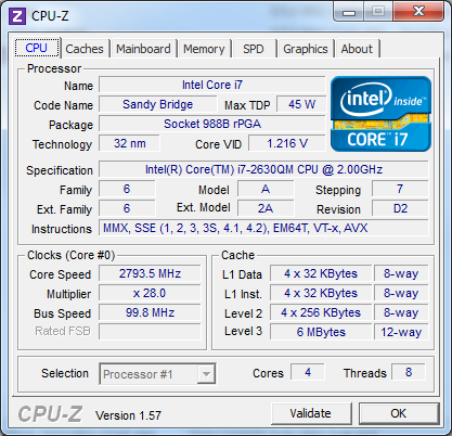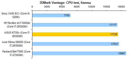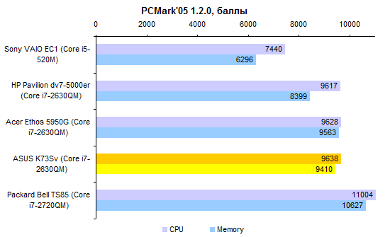 Ноутбук оборудован процессором Intel Core i7-2630QM — младшим из четырехъядерных ЦП Intel для ноутбуков, построенных на архитектуре Sandy Bridge. Номинальная тактовая частота этой модели составляет 2 ГГц, в режиме Turbo Boost процессор умеет разгоняться до 2,9 ГГц. Это заметно меньше, чем у более продвинутых процессоров линейки. Кроме того, в i7-2630QM нет поддержки набора инструкций AES-NI, что тоже стоит иметь в виду. ![]() Сложно сказать, насколько вышеописанные ограничения компенсируются ценой. К сожалению, сравнить стоимость этого ЦП со старшими моделями нет возможности — он не фигурирует в прайс-листе Intel. Так или иначе, производители ноутбуков чрезвычайно охотно используют именно Core i7-2630QM в своих «четырехъядерных» конфигурациях — остается надеяться, что экономят они на этом не совсем уж полные копейки. ![]() В ASUS K73Sv использована «гибридная» графическая система с технологией автоматического переключения между адаптерами NVIDIA Optimus. Экономичная графика — Intel GMA HD 3000 — интегрирована непосредственно в процессор. В стандартном режиме встроенное графическое ядро Core i7-2630QM работает на той же частоте, что и в старших моделях процессоров, — 650 МГц. А вот в «турборежиме» частота меньше: 1100 против 1300 МГц. ![]() Второй адаптер, представляющий производительную часть тандема, — NVIDIA GeForce GT 540M. С ним мы уже встречались при тестировании первого ноутбука на Sandy Bridge. Использованная в ASUS K73Sv версия GT 540M немного отличается от протестированной ранее: частота работы памяти повышена с 800 до 900 МГц, а ее объем уменьшен с 2 до 1 Гбайт. Более чем разумный «обмен». ![]() Заменяемые компоненты системы скрываются за единственным лючком на днище ноутбука. Здесь можно обнаружить два слота расширения памяти и единственный разъем Mini Card, в который получится установить только платы половинного размера. И самое, пожалуй, главное: два отсека для жестких дисков. В данном случае, в них покоились два быстрых и весьма емких винчестера Seagate — однако в розничных ноутбуках вполне вероятно появление менее дорогих накопителей. Что не может не радовать, разъемы для подключения винчестеров совершенно стандартные. Так что покупатели однодисковых конфигураций, похоже, не будут испытывать проблем с самостоятельной установкой второго накопителя. Конечно, встречались в истории случаи, когда производитель искусственно затруднял данную операцию — например, делал в пластиковой крышке лючка массивные выступы, не позволявшие так вот запросто установить второй винчестер, или вовсе не распаивал второй разъем. Но конструкторы ASUS в таких «шутках» до сих пор не были замечены. ⇡#Тестирование — производительность