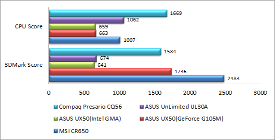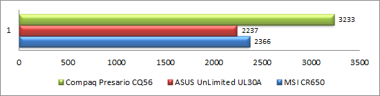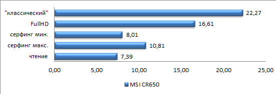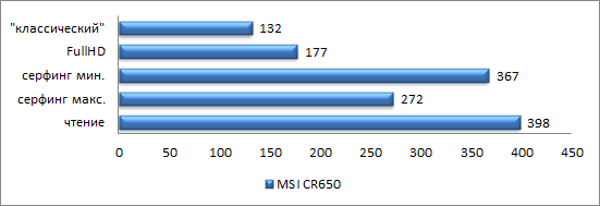 Сравнительная диаграмма тестирования в игровых приложениях ⇡#Источник питания и автономная работаВ ноутбуке по умолчанию установлен аккумулятор с довольно скромной ёмкостью на 49 Вт*ч, что не так много по современным меркам. Испытания проводились в пакете Battery Eater Pro в режимах «Классический» с максимальной яркостью подсветки, «Читательский» с минимальной яркостью подсветки, при просмотре Full HD-видео с максимальной яркостью подсветки, а также в режиме интернет-серфинга как с максимальной, так и с минимальной яркостью подсветки. Результаты тестирования приведены ниже на сводной диаграмме:  Сводная диаграмма времени автономной работы Также ниже приведена сравнительная диаграмма, демонстрирующая потребление энергии.  Сводная диаграмма энергопотребления ⇡#ВыводMSI CR650 есть не что иное, как обычный среднеформатник с невысокой производительностью и не самой низкой стоимостью. На ультрабюджетную рабочую лошадку такое решение не тянет ну никак. Но всё же есть у ноутбука и огромные плюсы. Для начала это длительность автономной работы и довольно мощная для недорогого ноутбука видеоподсистема, которая позволяет при базовых настройках качества запускать многие современные игры. Кроме того, у MSI CR650 очень тихая активная система охлаждения, а также низкий нагрев корпуса, что окажется кстати, если приходится работать с ноутбуком при высокой температуре окружающей среды. Вдобавок он достаточно лёгкий. Также к плюсам устройства стоит отнести высокое качество звука на аналоговом аудиовыходе. Из существенных минусов же можно отметить разве что маркий глянцевый корпус и несколько завышенную цену. Благодарим украинское представительство MSI за предоставленное для тестирования оборудование. А также компанию Графитек (г. Москва) за предоставленный комплект колориметров Spyder3Studio.