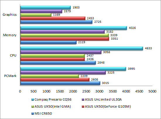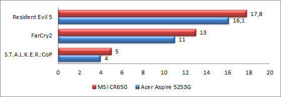 Сравнительная диаграмма результатов тестирования PCMark Vantage Также производительность системы была измерена в играх, S.T.A.L.K.E.R.: Зов Припяти и Far Cry 2 при помощи распространяемых с играми тестовых пакетов. В бенчмарках Crysis и Far Cry 2 тестовая сцена запускалась 5 раз, в таблицы результатов вносились усреднённые данные 5 запусков, бенчмарк S.T.A.L.K.E.R.: Зов Припяти запускался единожды, но тестовая сцена прогонялась при различных погодных условиях. Запуск тестовых сцен для всех игровых бенчмарков производился при разрешении 1280х720 точек. Кроме того, тестирование было проведено в бенчмарке Resident Evil 5 с тем же разрешением 1280х720 точек. В качестве оппонента тут выступил ещё один среднеформатник на AMD Brazos — Acer Aspire 5253G.