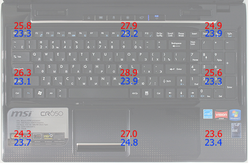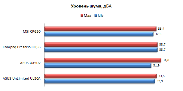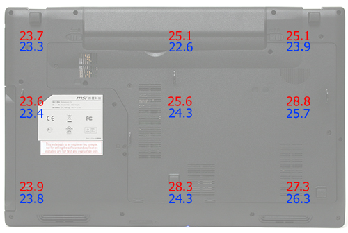 ⇡#Сетевые интерфейсыТут производитель немного сэкономил. Притом что ноутбук нельзя назвать ультрабюджетным, на борту нет Bluetooth-модуля, который нередко бывает весьма полезным. Беспроводной и Ethernet адаптеры производства Realtek, то бишь не шибко дорогие, но всё же проводной адаптер гигабитный, а беспроводный поддерживает стандарт 802.11n — всё, что необходимо для работы, есть. Настройка сетевых соединений осуществляется строго средствами установленной ОС. ⇡#Уровень шума и тепловой режимЗамер уровня нагрева производится при комнатной температуре (+21 °C) для девяти точек днища и рабочей области. Процессор AMD E-350 обладает низким TDP и при этом заключён в большой корпус, причём не ультратонкий, а обычный, поэтому тут легенда о чрезвычайно горячих процессорах AMD так и останется легендой. В режиме простоя или при офисных нагрузках, а также при просмотре HD-видео 720p корпус разогревается лишь на пару градусов относительно температуры окружающей среды, что весьма радует, особенно если вспомнить жаркое лето 2010 года, когда большинство ноутбуков сложно было долго держать на коленях из-за сильного нагрева днища. После часового циклического прогона пакета 3DMark 2006 температура корпуса в некоторых точках выросла ненамного, а в некоторых и вовсе практически не изменилась. На приведённых ниже иллюстрациях показания, нанесённые синим цветом, обозначают температуру корпуса после 2-часового простоя, а красным — после работы под нагрузкой в течение часа.  MSI CR650. Температурный режим. Днище  MSI CR650. Температурный режим. Рабочая область При невысоких, средних и даже не слишком длительных (до одной минуты) нагрузках кулер крутится на первой скорости, а уровень шума не превышает 32,5 дБА. При длительных высоких нагрузках шум увеличивается до 33,4 дБА, при этом из вентиляционного отверстия идёт лишь слегка тёплый, но не горячий воздух. Вторая скорость не максимальная, но при температуре окружающей среды 21 °C никакие нагрузки до следующей скорости кулер не разгонят, поэтому в сравнительную диаграмму пойдут именно указанные значения. Если же закрыть вентиляционную решётку, то при высоких нагрузках кулер плавно разгоняется до третьей скорости, при которой уровень шума достигает 41,7 дБА, но это ещё не максимум, далее ноутбук вообще ставит рекорды — при установке четвёртой скорости уровень шума достигает отметки 43,6 дБА. Стоит отметить, что из вентиляционной решётки всегда идёт лишь слегка тёплый воздух, поэтому такая перестраховка с высокими скоростями (видимо, с расчётом на жаркий климат) не совсем понятна. Ниже приведена сводная диаграмма уровня шума в режиме простоя и в режиме максимальной нагрузки для ноутбуков MSI CR650, ASUS UX50, ASUS UnLimited UL30A и Compaq Presario CQ56  Сводная таблица уровня шума в режиме простоя и в режиме максимальной нагрузки ⇡#Производительность