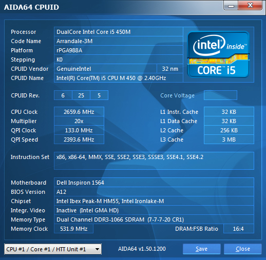 ![]() Информация о процессоре ![]() Тестирование кеша и памяти ![]() Информация о видеоподсистеме ⇡#Комплект поставкиКомплект поставки ноутбука довольно прост: зарядное устройство, несколько брошюр, инструкция и бесполезный диск с ОС Free DOS. В общем, стандартный набор для недорогого ноутбука. Диска с драйверами для ОС семейства Windows в комплекте нет, но все драйверы можно загрузить на сайте производителя. ⇡#Внешний видВид общий Тестируемый ноутбук поставляется в двух цветовых решениях — с голубой крышкой или с красной — и рассчитан на любителей ярких и стильных гаджетов. Расцветка остальных панелей более традиционная — часть из них черная, а панель рабочей области выкрашена под металл с грубой обработкой. Крышка и рабочая область покрыты толстым слоем лака, глянцевая поверхность которого неожиданно неплохо противостоит царапинам, да и отпечатки на светлом фоне не особо заметны — от них страдает лишь чёрный глянцевый кант дисплея. Вид общий Качество сборки высокое, но жёсткость корпуса невелика, поэтому при попытках скручивания он немного поддаётся, хотя и не скрипит. На тестирование попала модификация с усиленным аккумулятором, ёмкость которого составляет 90 Вт*ч, что является весьма достойным показателем. Вот только одно плохо — усиленный аккумулятор существенно выступает за пределы корпуса, поэтому ноутбук влезет не в каждый чехол/папку, хотя в любую сумку или рюкзак для ноутбука Dell Inspiron 1564 с усиленным аккумулятором помещается без проблем. Вид спереди Индикаторы активности и состояния Спереди находится лишь три светящихся белым индикатора активности. Вид сзади Тыльная сторона практически полностью занята аккумулятором. Вид слева Слева находится петля для замка безопасности, гнездо подключения блока питания, вентиляционная решётка, порт D-Sub (VGA), Ethernet-порт (RJ-45), а также разъемы HDMI и USB. Вид справа Правая сторона также не пустует, тут расположилась пара стандартных аудиоразъёмов, два USB-порта, слот установки карт памяти, а также крышка лотка привода оптических дисков. Вид снизу Днище ноутбука плоское, поэтому вентиляции ничто не мешает, кроме того, в модификациях с усиленным аккумулятором задняя часть приподнята, что, разумеется, положительно сказывается на охлаждении. Вот только вентиляционных отверстий совсем немного, хотя, забегая вперёд, стоит отметить, что ноутбук не из холодных. Корпус опирается на четыре довольно крупные резиновые ножки, но площадь контакта с установочной поверхностью невелика, потому как соприкасаются они со столешницей лишь краями, которые немного выступают относительно основной поверхности. Снизу доступен единый отсек установки модулей памяти, карт расширения и жёсткого диска, также на днище находится пара динамиков. Вид справа с открытой на максимальный угол крышкой Несмотря на использование утопленных петель, крышка ноутбука раскрывается на угол чуть больше привычных 130-135 градусов, поэтому работать с ним удобно в любом положении. Клавиатура Dell Inspiron 1564 оборудован низкопрофильной клавиатурой с дополнительным цифровым блоком, клавишами с трапециевидным профилем, шириной основания литерной клавиши 18,5 мм и контактной площадки — 15,5 мм. Кнопки дополнительного цифрового блока немного ужаты: ширина основания составляет 14,5, а контактной площадки — 12,5 мм. Клавиши-стрелки чуть больше стандартно