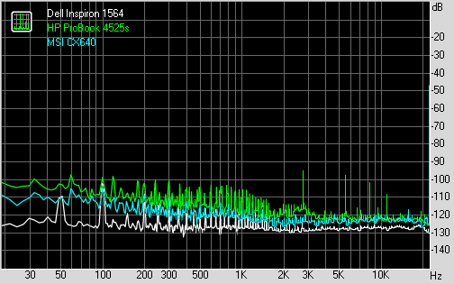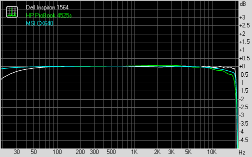 Также после калибровки была измерена зависимость цветовой температуры от уровня яркости при целевом значении 6500 K. Как видно на графике, при уменьшении яркости подсветки цветовая температура стремительно растёт, тем самым искажая реальные цвета. ![]() Зависимость цветовой температуры от уровня яркости подсветки ⇡#Звуковая подсистемаКак уже упоминалось, динамики ноутбука расположены на днище, поэтому звучание встроенной акустики сильно зависит от того, каким образом установлен ноутбук. Если работать навесу или с ноутбуком на коленях, то звук годится разве что для сопровождения действий ОС, а вот при установке на столешницу звучание немного улучшается и вполне подходит для фонового прослушивания музыки либо просмотра учебного/рекламного материала. Для фильмов динамики не годятся — звук пустоват, хотя запас громкости в целом весьма приличный, да и каких-либо ярко выраженных недостатков вроде скрипа/шипений/треска замечено не было даже при установке максимального уровня громкости. Звуковой тракт ноутбука основан на базе хорошо знакомого 4-канального (2+2 канала) HD-аудиокодека Realtek ALC269 с заявленным соотношением сигнал/шум для ЦАП и АЦП, равным 98 дБ. С более подробными характеристиками кодека можно ознакомиться на сайте производителя. Тестирование аудиотракта производилось в пакете RightMark Audio Analyzer (далее RMAA) при помощи звукового интерфейса Creative E-MU 0202 USB. Все спецэффекты отключены, настройки эквалайзера выставлены по умолчанию. Перед началом тестирования драйверы аудиокодека были обновлены до наиболее свежей версии на момент тестирования. В качестве оппонентов были взяты ноутбуки HP ProBook 4525s и MSI CX640. Режим работы: 16-бит, 44 кГц.