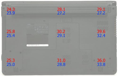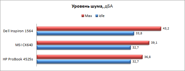 ⇡#Сетевые интерфейсыВ принципе, у ноутбука есть всё необходимое: Wi-Fi и Bluetooth. Но производитель всё же немного сэкономил, установив не гигабитный, а Fast Ethernet-адаптер. Конечно, в эпоху повсеместного распространения Wi-Fi-точек доступа проводное сетевое подключение постепенно уступает место беспроводному, но всё же можно было раскошелиться на гигабитный адаптер, ведь Dell Inspiron 1564 не ультрабюджетное решение. Настройки всех соединений осуществляются строго средствами устанавливаемой ОС, и каких-либо надстроек или автономных утилит нет ни в комплекте поставке, ни на сайте производителя. ⇡#Уровень шума и тепловой режимВ режиме простоя и при невысоких нагрузках (например, прослушивании музыки, работе в офисных пакетах) уровень шума довольно невелик и не превышает 33,8 дБА, но даже при кратковременных средних нагрузках он подскакивает до 35,6 дБА… и это при стандартной температуре окружающей среды +21°C, а при более высоких температурах кулер периодически разгоняется до второй скорости даже в режиме простоя. При высоких нагрузках уровень генерируемого шума сразу подскакивает до 38,7 дБА, после чего следует отметка 40,6 дБА, а максимум составляет 43,2 дБА, что уж слишком для ноутбука, не претендующего на звание геймерского. Удивительно, но скорость вращения кулера падает только через минуту-другую после прекращения нагрузки. Также стоит отметить довольно резкую смену скоростей, из-за чего система охлаждения привлекает к себе слишком много внимания. Ниже приведена сводная диаграмма уровня шума в режиме простоя и в режиме максимальной нагрузки для HP Probook 4525s, MSI CX640 и тестируемого ноутбука. Измерение уровня шума производилось на расстоянии 20 см от центра передней панели. ![]() Сводная таблица уровня шума в режиме простоя и в режиме максимальной нагрузки Замеры уровня нагрева корпуса осуществлялись в девяти точках днища и девяти точках рабочей области после двух часов работы в режиме простоя, а также после 30-минутного прогона пакета 3DMark 2006, температура окружающей среды и установочной поверхности во время измерений составляла +21°C. В режиме простоя рабочая область ноутбука в зависимости от точки измерений разогревалась до 24,5-29,6°C, а днище до 23,9-33,8°C. После получасовой нагрузки рабочая область разогрелась до 24,7-31,6°C, а днище до 24,3-39,6°C. На приведённых ниже иллюстрациях синими цифрами указана температура в режиме простоя, а красным — после получасовой нагрузки. ![]() Температурный режим. Днище ![]() Температурный режим. Рабочая область ⇡#Производительность
