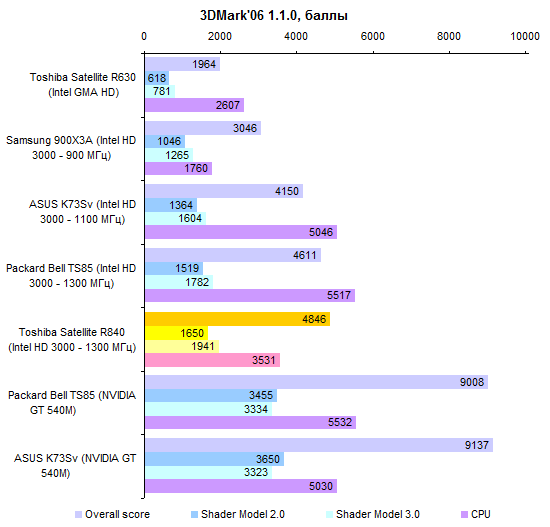 По мнению 3DMark’06, графическое ядро работает заметно быстрее, чем точно такое же в процессоре Core i7-2720QM. И, разумеется, нельзя не отметить тотальное превосходство нового поколения графики Intel над предыдущим.