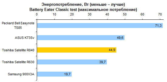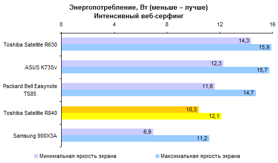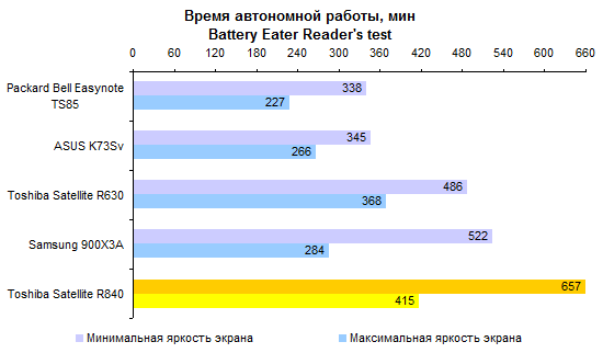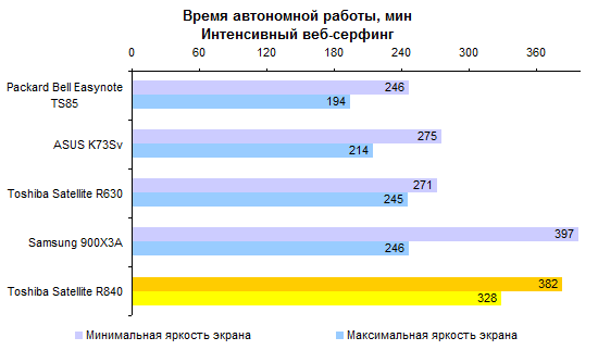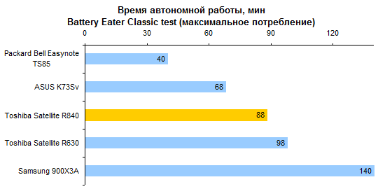 Все предыдущие случаи знакомства с процессорами Intel Sandy Bridge позволяли надеяться, что со временем автономной работы в этот раз дело будет обстоять как минимум хорошо. Toshiba Satellite R840 оправдала эти надежды сполна: несмотря на очень высокую производительность процессора, этот ноутбук может проработать в режиме минимального энергопотребления до 11 часов.