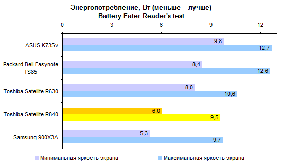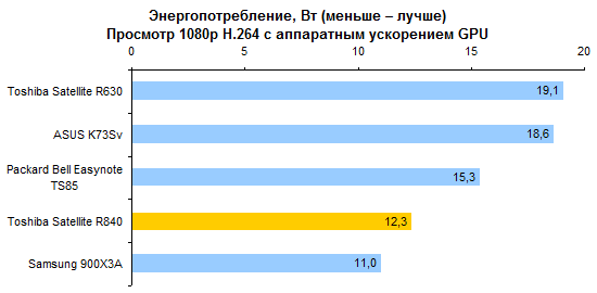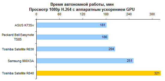 Те же 5,5 часов можно смотреть Full HD-видео с максимальной яркостью дисплея. Между прочим, это рекорд: Toshiba Satellite R840 — первый протестированный нами ноутбук, который способен воспроизводить 1080p более пяти часов.