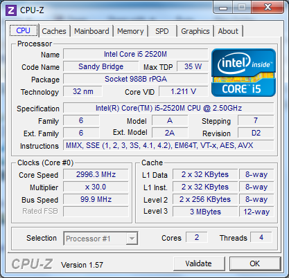 | Процессор | Intel Core i5-2520M: 2,5 ГГц (до 3,2 ГГц в режиме Turbo Boost); 2x256 Кбайт L2; 3 Мбайт L3; два вычислительных ядра |
