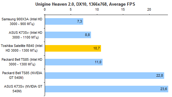 При тестировании Samsung 900X3A мы столкнулись с эффектом потери производительности из-за недостаточно эффективного отвода тепла от процессора системой охлаждения. Было любопытно посмотреть, не страдает ли Toshiba Satellite R840 от той же проблемы — в конце концов, корпус здесь тоже не слишком просторный.