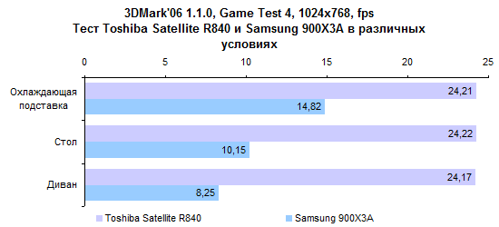Необычная система охлаждения Toshiba оказалась вполне эффективной. Неважно, стоит ли ноутбук на охлаждающей подставке, просто на столе или на диване, — на производительность это не влияет.