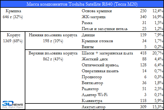 Дырявое как решето и чрезвычайно гибкое днище Satellite R840 сделано из стандартной смеси PC+ABS (поликарбонат и акрилонитрилбутадиенстирол) и весит 159 грамм. Вместе со съемными лючками и многочисленными винтиками — 198 грамм, что составляет почти 10% от общей массы ноутбука. Для сравнения: прочное дно 13-дюймового Samsung 900X3A, выполненное из магниевого сплава, весит всего 115 грамм.