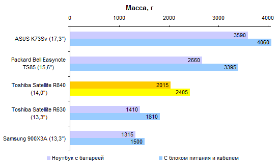 Как уже было сказано, ноутбук весит относительно немного — во всяком случае, по меркам 14-дюймовых моделей. Но до наиболее легких «тринашек» ему, конечно же, далеко: та же Toshiba Satellite R630 оказывается на 600 грамм легче, практически в полтора раза.