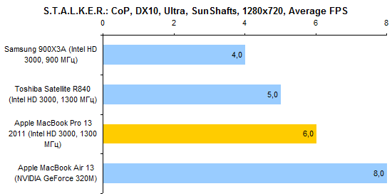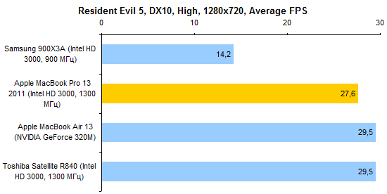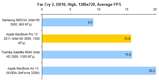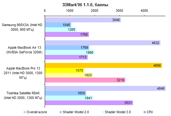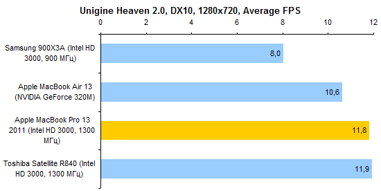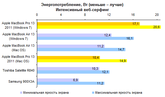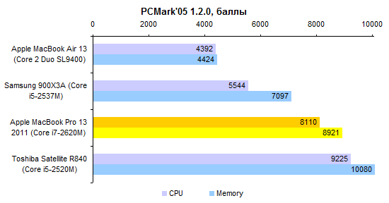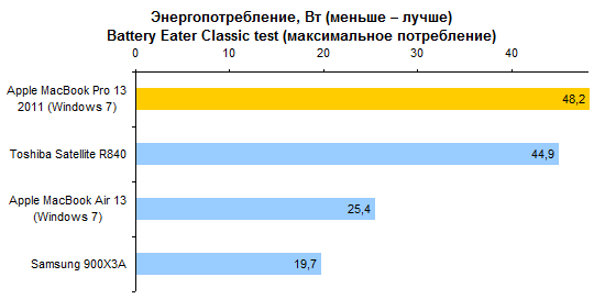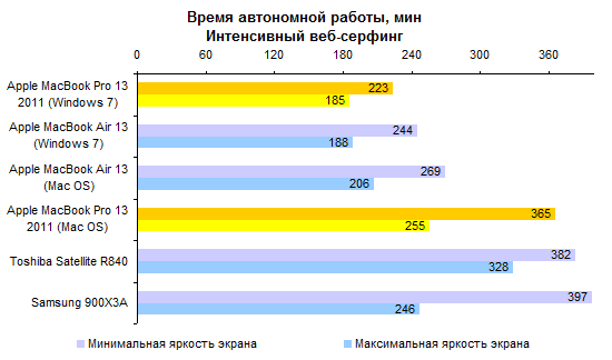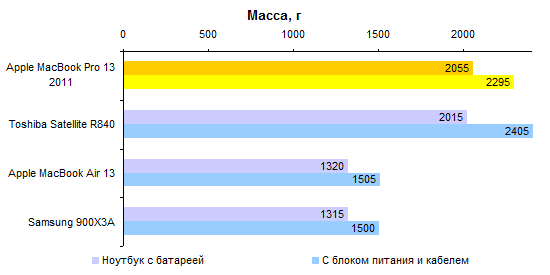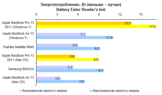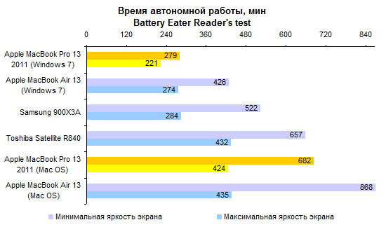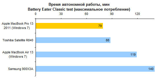 Несмотря на то, что установленный в MacBook Pro 13 процессор Core i7-2620M обладает более высокими характеристиками, чем Core i5-2520M, использованный в ноутбуке Toshiba, результаты тестирования в PCMark’05 хуже. Похоже, здесь проявляется тот же эффект, что и в Samsung 900X3A, — система охлаждения недостаточно эффективно отводит тепло от процессора, из-за чего он не может разогнаться до того уровня, который теоретически возможен.  Та же картина и в тесте 3DMark’06 — результаты старшего процессора снова хуже.  В одних графических приложениях быстрее адаптер NVIDIA, в других может немного вырываться вперед интегрированная графика Intel. Но в целом — паритет.     Это, конечно, неплохо для Intel — в предыдущих поколениях дела обстояли на порядок хуже. А вот конкретно для MacBook Pro 13 это не очень хорошо: невесомый MacBook Air 13 в графических тестах оказывается примерно столь же производительным, что и тяжелый Pro с тем же размером дисплея. ⇡#Тестирование — масса, время автономной работыКак и все прочие современные ноутбуки Apple, «про-тринашка» оборудована несъемным аккумулятором, состоящим из плоских элементов питания. Но, в отличие от более крупных моделей, этих элементов в корпус поместилось не очень много. Емкость аккумулятора составляет 64 Вт*ч — значение неплохое, но далеко не рекордное. Комплектный блок питания обладает мощностью 65 Вт. Он немного крупнее и примерно на 50 грамм тяжелее 50-ваттного адаптера MacBook Air. Конструкция точно такая же: адаптер можно подключать напрямую к розетке с помощью съемной вилки. Если же требуется отдалиться от источника электроэнергии, то можно сменить вилку на шнур. Масса MacBook Pro 13 образца 2011 года даже немного выше, чем у прошлогодней модели. И это удивительно — казалось бы, ну куда уж еще тяжелее. Ноутбук с 13-дюймовым дисплеем, без внешней графики — и массой более 2 килограмм? Очень странное сочетание характеристик.  Прошлогодние ноутбуки Apple очень хорошо смотрелись на фоне своих Windows-аналогов благодаря неправдоподобно эффективной оптимизации энергопотребления. В этом году Windows-ноутбуки стали работать от батареи значительно дольше. А вот макбуки прибавили не так уж сильно. В итоге время автономной работы уже не так сильно впечатляет.  Результаты тестирования MacBook Pro 13 в операционной системе Windows выглядят совсем плохо. Видимо, в Apple еще не «допилили» драйвера. С другой стороны, ноутбук в продаже уже достаточно давно, если драйвера не оптимизировали до сих пор, то есть ли надежда на последующее исправление?  Время автономной работы при пользовании Интернетом через беспроводную сеть — больное место всех макбуков. Не стала исключением и модель MacBook Pro 13: Wi-Fi бьет по батарее сильнее, чем в случае ноутбуков с Windows.  Даже при использовании «родной» операционки, в режиме веб-серфинга макбук оказывается хуже аналогичного Windows-ноутбука.  Та же картина наблюдается и в режиме воспроизведения Full HD-видео.   В режиме работы с максимальной нагрузкой на систему MacBook Pro 13 оказывается наиболее прожорливым из всех сравниваемых ноутбуков.   При беспроводном веб-серфинге со средней яркостью дисплея MacBook Pro 13 способен проработать примерно на час дольше, чем Air 13. При воспроизведении видео разница составляет около получаса. Прибавка довольно-таки существенная. Но будет ли ее достаточно, чтобы компенсировать настолько большую разницу в массе? ⇡#ВыводыMacbook Pro 13 разлива 2011 года — один и