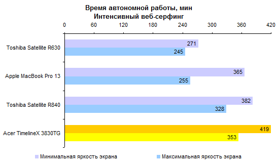 Если говорить о работе с интернет-страницами через беспроводную сеть, то TimelineX 3830TG способен обеспечить 6-7 часов этого удовольствия — в зависимости от яркости дисплея. До заветных 8 часов, полного рабочего дня, осталось совсем немного. Неужели через год-другой можно будет вовсе не брать на работу блок питания?