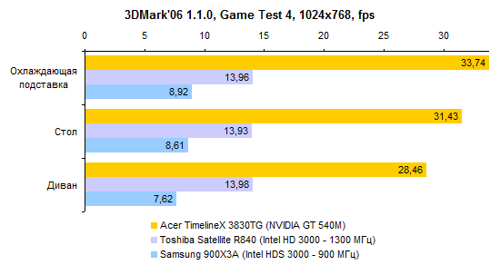 Производительность существенно зависит от внешних условий: потери составляют до 23%. Следовательно, система охлаждения справляется со своей задачей недостаточно эффективно. Из этого вытекает совет: если есть желание получить максимум скорости при работе на TimelineX 3830TG с тяжелыми приложениями, следует обзавестись подставкой с активным охлаждением. Иначе полностью потенциал ноутбука раскрыт не будет.