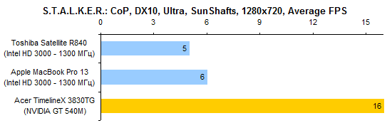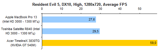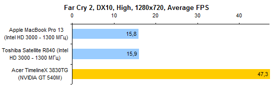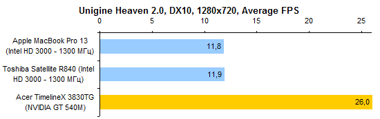 В тестах графической системы Acer TimelineX 3830TG автоматически оказывается лидером. Несмотря на серьезные успехи Intel в деле наращивания графической производительности интегрированных решений, с NVIDIA GeForce GT 540M им все еще тягаться не по силам.