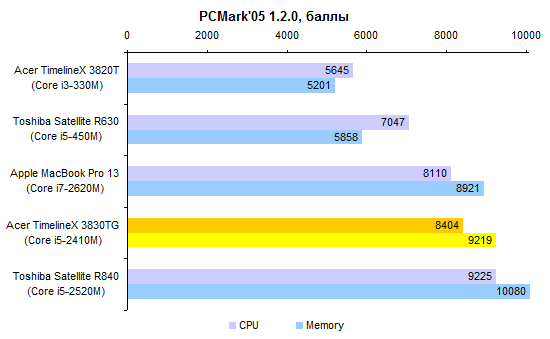 Выигрыш от использования внешней графики хорошего уровня весьма велик: в зависимости от конкретного приложения, TimelineX 3830TG обгоняет модели со встроенной графикой в 2-3 раза.