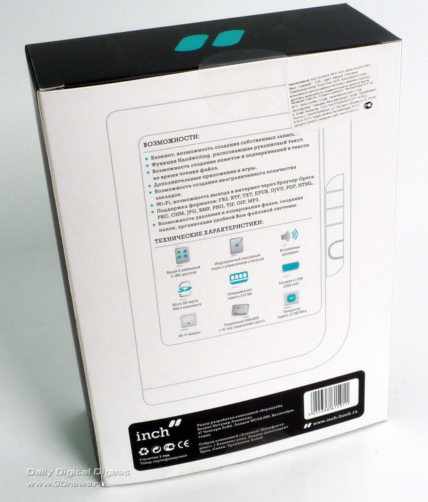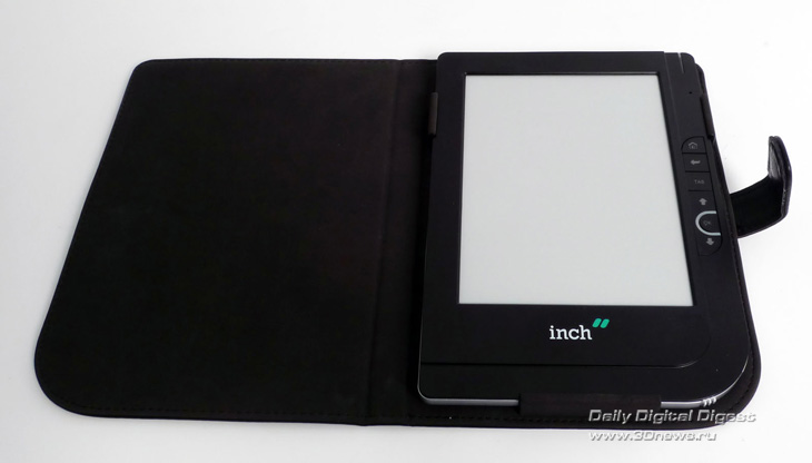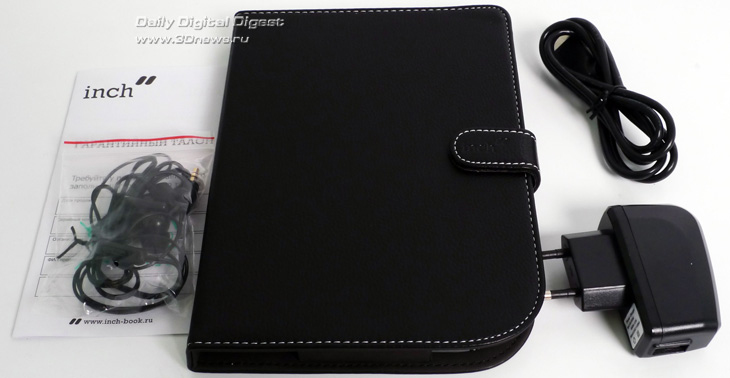 На полке магазина потенциальный покупатель увидит скромно оформленную коробку с фотографией устройства и кратким списком его возможностей. Единственная завлекаловка — указание, что ридер не только поддерживает Wi-Fi, но ещё и обладает встроенным браузером Opera, который в России поразительно популярен. В самой коробке обнаружится гарантийный талон, гарнитура, блок питания с выходом USB, кабель USB ↔ mini-USB и кожаный чехол, в котором покоится сама книга. Чехол хорош. Во-первых, он сделан достаточно качественно. Во-вторых, книга в нём крепится намертво. Минусом является только довольно солидный вес — читалка в чехле заметно оттягивает руку.