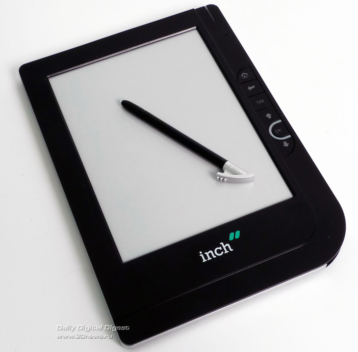 Дизайн устройства скромный, но приятный. Корпус сделан из твёрдого чёрного пластика, увы, собирающего отпечатки пальцев. По бокам он окантован полоской из серебристого пластика, а правый нижний угол скруглён. В нём прячется стилус, который выдвигается вбок. Шесть кнопок управления объединены в один блок и находятся справа от экрана. Если держать книгу в правой руке, то клавиши листания как раз попадают под большой палец. Кнопка [ОК] окружена полукруглой полоской с оранжевой подсветкой — своеобразный индикатор работы. Чуть выше блока клавиш разместилось отверстие встроенного микрофона, а ещё выше есть другая светодиодная полоска — на этот раз для индикации заряда устройства.
