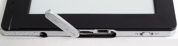 На верхнем торце размещается гнездо для наушников (3,5 мм), ползунок для включения/выключения питания и адаптера Wi-Fi. Под заглушкой спрятан порт mini-USB и гнездо для карт micro-SD.