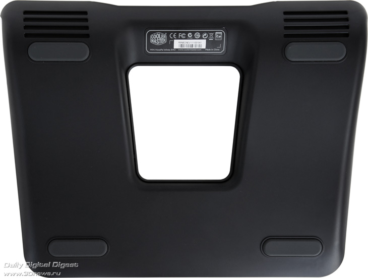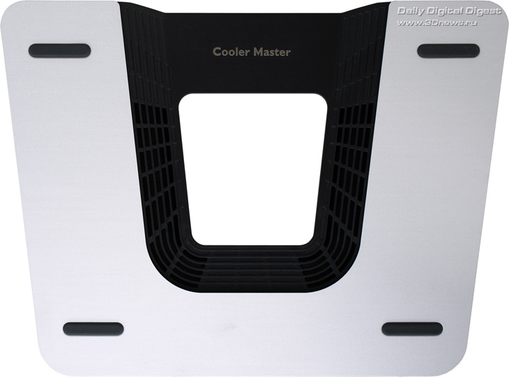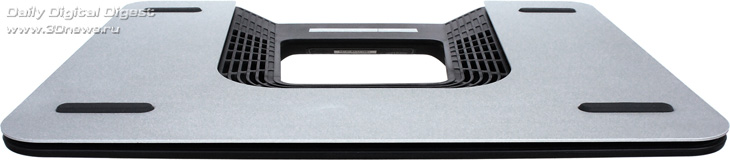Основа — нижняя половинка корпуса подставки — выполнена из пластика. По большей части матового, немаркого, лишь в области разъемов и элементов управления зачем-то использованы глянцевые вставки. Рабочая поверхность — то, на чем будет стоять ноутбук, — представляет собой цельный алюминиевый лист. Толщина его невелика, около миллиметра. Однако жесткость поверхности вполне достаточная — лист совершенно не прогибается даже под сильными нажатиями.