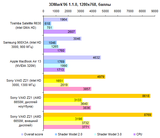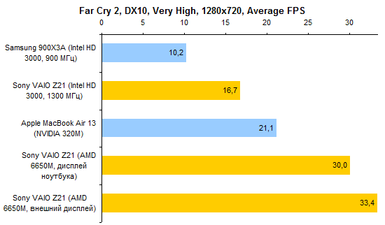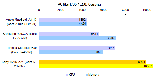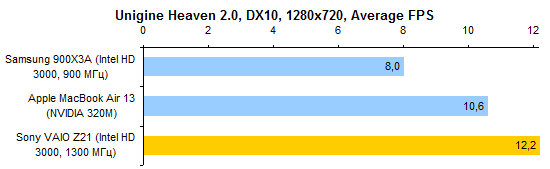 Помимо всего прочего, интегрированный в этот ЦП графический адаптер также является самым мощным из решений Intel. Производительность его примерно соответствует дискретному GeForce 320M, который устанавливают в современные MacBook Air. Так что в мобильном варианте использования между VAIO Z21 и «воздушным» ноутбуком по части графики паритет.
