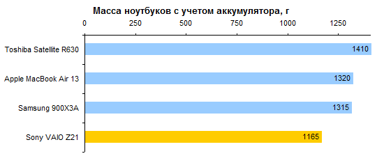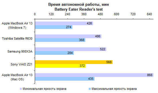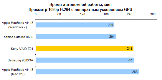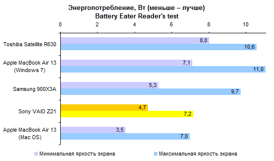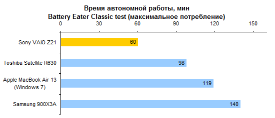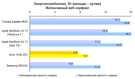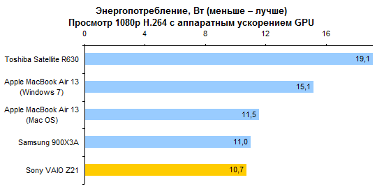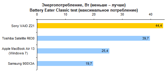 При этом по энергопотреблению VAIO Z21 поставила новый рекорд нашей тестовой лаборатории среди устройств, работающих под управлением Windows (включая нетбуки). Настолько хорошо «замирать» до сих пор умели только «макбуки» и только в родной для них Mac OS.