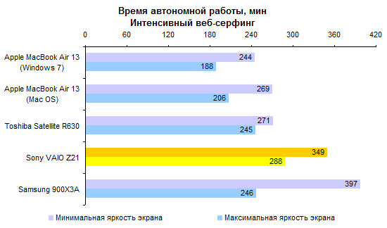 В режиме работы с веб-страницами по беспроводной сети результаты получаются заметно хуже – однако до того «падения в пропасть», которое характерно для фруктовых ноутбуков, все же далеко.