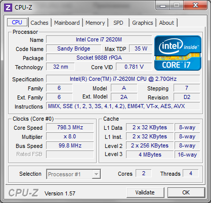 Intel Core i7-2620M: 2,7 (3,4) ГГц, 4 Мбайт L3, два ядра |