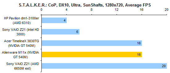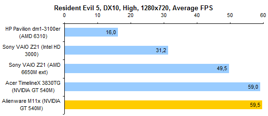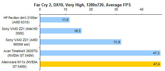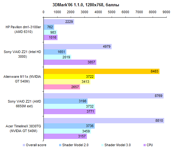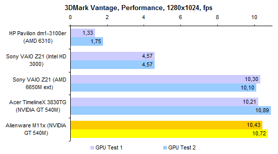 Ну а результатам Alienware M11x в графических тестах могут позавидовать и более крупные ноутбуки. Конечно, GeForce GT 540M — не «хай енд». Но по меркам ноутбуков это хороший адаптер, особенно если речь идет о настолько компактных моделях.