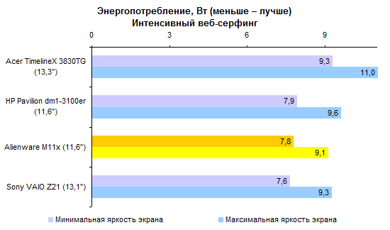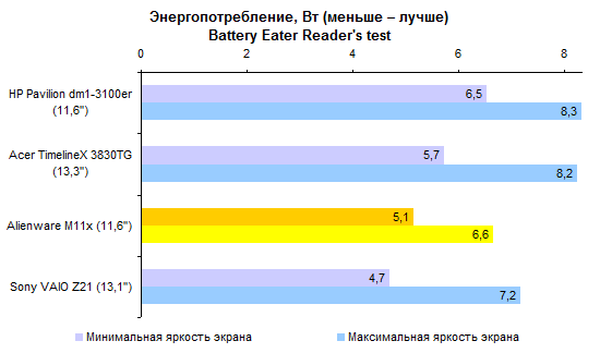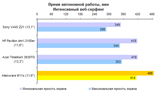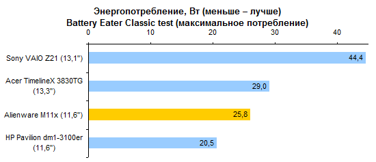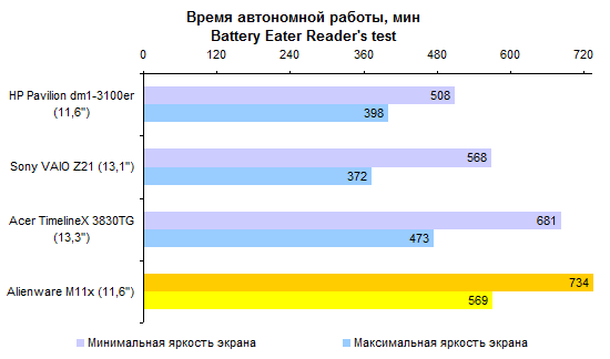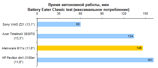 Благодаря сравнительно холодному и экономичному ULV-процессору, даже в режиме максимальной нагрузки на систему Alienware M11x может продержаться довольно долго — до двух с половиной часов.