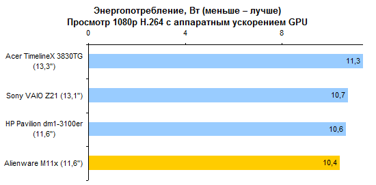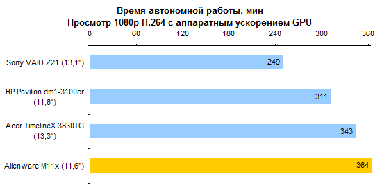 В тесте с просмотром Full HD-видео ноутбук поставил новый рекорд нашей тестовой лаборатории. С результатом в 6 часов с небольшим Alienware M11x на 20 минут обогнал прежнего рекордсмена, Acer TimelineX 3830TG.