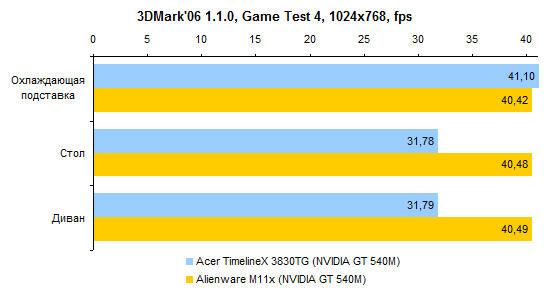 Вне зависимости от того, используется ли дополнительное охлаждение, стоит ли ноутбук на столе или даже на диване, результаты тестов остаются практически одинаковыми.