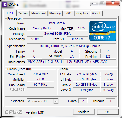 | Процессор | Intel Core i7-2617M: 1,5 ГГц (до 2,6 ГГц в режиме Turbo Boost); 2x256 Кбайт L2; 4 Мбайт L3; два вычислительных ядра |
