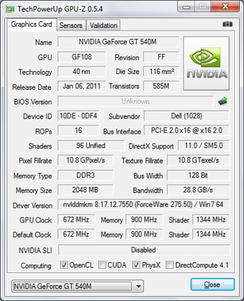 | Графический контроллер | Автоматически переключаемая графика (NVIDIA Optimus) Intel HD 3000 (950 МГц), интегрирован в процессор NVIDIA GeForce GT 540M (96 процессоров, 672 МГц), 2 Гбайт DDR3 (900 МГц) |