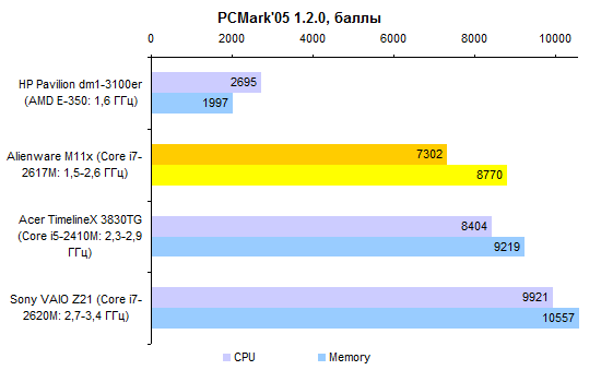 Несмотря на то, что номинальная частота процессора Core i7-2617M невелика, настройки динамического разгона Turbo Boost у него совсем не детские. Так что разница в производительности с «полноразмерными» собратьями в итоге не так уж существенна. Особенно если сравнивать с процессором AMD E-350.
