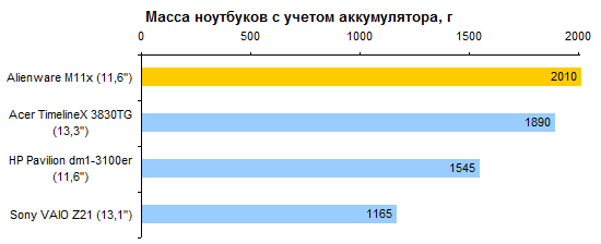 Остается только сказать спасибо, что не был выбран другой вариант: снижение веса батареи и всего ноутбука за счет уменьшения емкости. Так тоже бывает, и довольно часто. Но в Alienware поступили все же честнее: емкость составляет вполне приличные 63 Вт*ч, что выгодно отличает M11x от ультратонких моделей.
