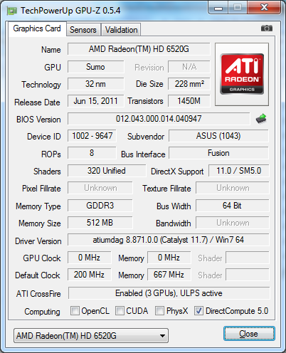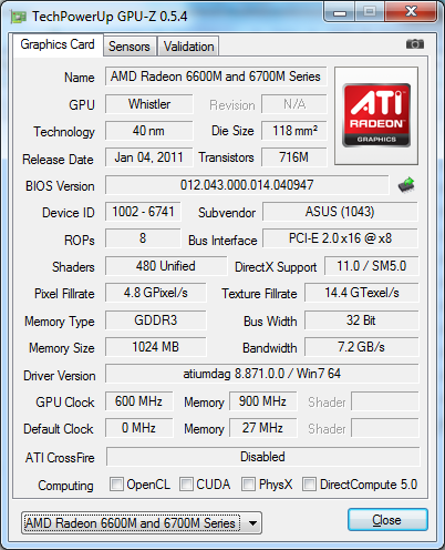 В ASUS K53TA дело обстоит немного иначе: в режиме высокой производительности видеоадаптеры способны работать в режиме Crossfire, образуя тандем под маркетинговым названием Radeon 6720G2.