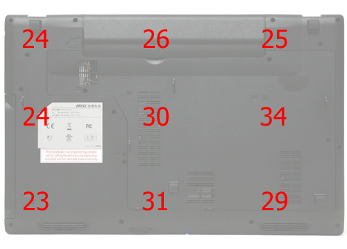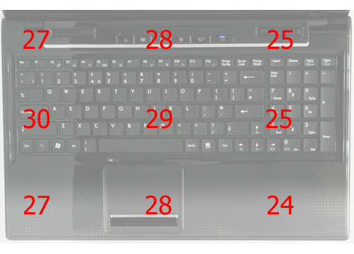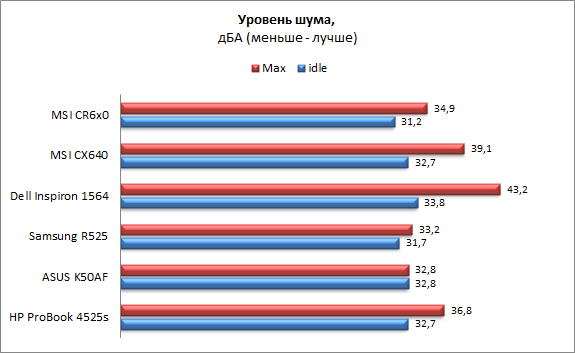 ⇡#Тестирование: уровень шума и тепловой режимВ плане генерируемого шума ноутбук оказался весьма удачным, ведь даже при средних и довольно длительных (до минуты) высоких нагрузках уровень шума не превышает 31,2 дБА. Да и при высоких нагрузках лишь изредка, буквально на несколько секунд, подскакивает до 34,9 дБА. При длительных максимальных нагрузках уровень шума поднимается до указанного значения 34,9 дБА, но иногда проседает до минимума даже до прекращения высокой нагрузки. Данный уровень шума максимальным не является, но идёт в зачёт как максимальный, ведь в тестовых условиях (+21 градус Цельсия) самая высокая скорость вращения вентилятора не активировалась. Для замера максимального генерируемого шума при высокой нагрузке на процессор были временно закрыты вентиляционные отверстия. И только тогда была достигнута максимальная скорость вращения, при которой уровень шума достиг отметки 39,5 дБА. Измерение уровня шума производилось на расстоянии 20 см от центра передней панели.  Замер уровня нагрева производится при комнатной температуре (+21 градус Цельсия) в девяти точках днища и девяти точках рабочей области. После часового циклического запуска пакета 3DMark 2006 температура рабочей области в зависимости от точки измерения составила 24-30 градусов Цельсия, а днища — 23-34 градуса.  Температурный режим MSI CR670: днище  Температурный режим MSI CR670: рабочая область ⇡#Тестирование: производительностьДля сравнения производительности в качестве оппонентов была подобрана довольно разношёрстная компания ноутбуков, которые основаны на процессорах как AMD, так и Intel. Итак, в качестве оппонентов выступили следующие модели: