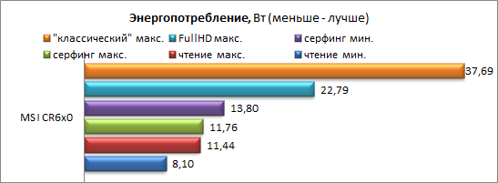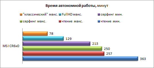 ⇡#Тестирование: время автономной работыВ протестированном ноутбуке установлен аккумулятор ёмкостью около 49 Вт*ч, что не так много по современным меркам. Испытания проводились в пакете Battery Eater Pro в режимах «классический» с максимальной яркостью подсветки и «читательский» с максимальной и минимальной яркостью подсветки. Также ноутбук был протестирован при просмотре Full HD-видео с максимальной яркостью подсветки и в режиме интернет-серфинга — как с максимальной, так и с минимальной яркостью подсветки.   ⇡#ВыводыКак показало тестирование, новый процессор не дал роста производительности в процессорных дисциплинах. Что и неудивительно: вычислительные ядра остались прежними. А вот встроенная графика показала отличные результаты. Всё же не зря AMD в свое время приобрела компанию ATI — результат слияния налицо, и Intel тут далеко позади. Что же касается непосредственно ноутбука, то он хорош: неплохая производительность видеоподсистемы сочетается с малым уровнем шума и невысоким нагревом корпуса. Кроме того, MSI CR670 весьма долго работает от аккумулятора — в «читательском» режиме по энергопотреблению новинка соизмерима с нетбуками! И всё это — без необходимости переключения между встроенным и интегрированным графическими адаптерами. Кроме того, у ноутбука весьма неплохие встроенные динамики, а на аналоговом аудиовыходе качество звука столь высоко, что MSI CR670 смог заработать «отлично» в бенчмарке RMAA. Из недостатков ноутбука стоит отметить глянцевую маркую поверхность и малые углы обзора дисплея. Благодарим украинское представительство MSI за предоставленное для тестирования оборудование. А также компанию «Графитек» (г. Москва) за предоставленный комплект колориметров Spyder3Studio.