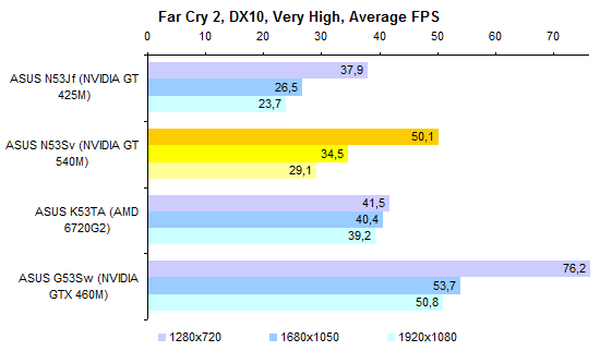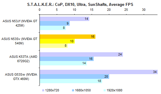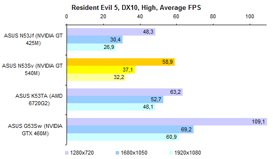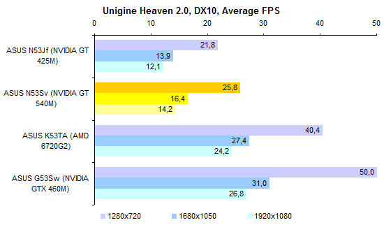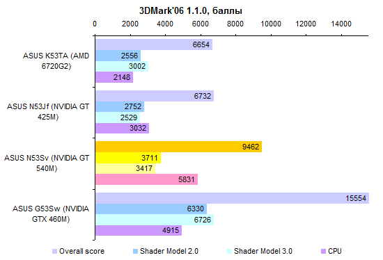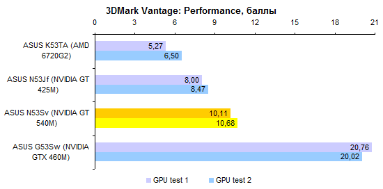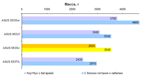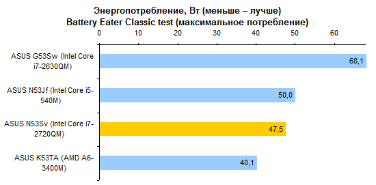 Как уже было сказано выше, ноутбуков с такой конфигурацией, как у протестированного, в (российской) природе не существует. Так что результатами тестов процессора Core i7-2720QM можно разве что немного повосхищаться — ведь действительно быстрый процессор! Но с практической точки зрения следует смотреть на результаты Core i7-2630QM — именно этот ЦП устанавливают в топовые конфигурации ASUS N53Sv.  А вот графика в этой модели может быть только одна — точно такая же, как в протестированном экземпляре. Если верить тестовым пакетам семейства 3DMark, адаптер NVIDIA оказывается заметно интереснее, чем гибридная графика, используемая в новой платформе AMD.   Но если посмотреть на результаты тестирования в альтернативной синтетике и играх, то дело обстоит совсем не так: AMD Radeon 6720G показывает заметно более высокую производительность — а стоят ноутбуки на основе этого «гибрида» заметно дешевле.     GeForce GT 540M неплохо смотрелся в начале года. Но за прошедшее время ситуация немного изменилась. Нынче решения такого уровня любимый конкурент NVIDIA предлагает за сущие копейки. Пора бы компании назначить самым ходовым видеоадаптером для ноутбуков что-то более мощное. ⇡#Тестирование — масса, время автономной работыПротестированный экземпляр ASUS N53Sv был оборудован 6-элементным аккумулятором достаточно скромной емкости — около 48 Вт*ч. Комплектный блок питания оказался 120-ваттным, очень крупным и тяжелым — даже без проводов он потянул на полкило с небольшим. Можно предположить, что это особенность данного конкретного семпла. Розничным ноутбукам с менее мощными процессорами должно хватить обычных 90-ваттных адаптеров, куда более компактных и легких. Масса ноутбука довольно высока для модели с диагональю дисплея 15,6 дюйма. Впрочем, это еще прогресс: по сравнению с ноутбуком ASUS N53Jf — тот же корпус, но прошлогодняя начинка — новая модель стала легче примерно на 150 грамм. Все же хотелось бы, чтобы ноутбуки ASUS теряли лишний вес более интенсивно.