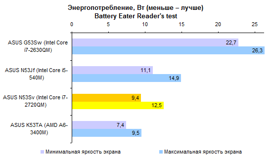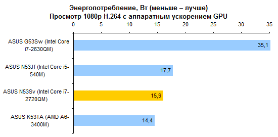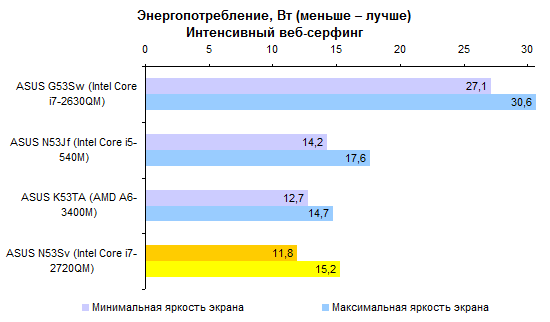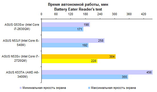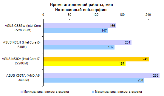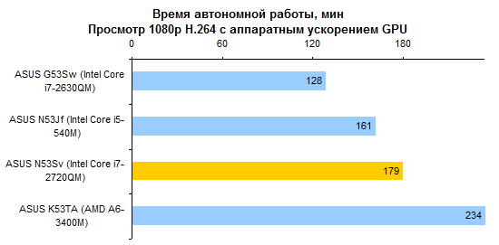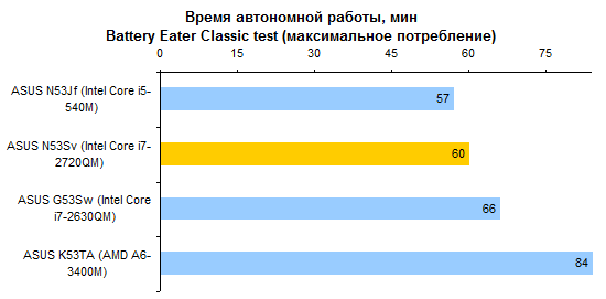 Недостаточно емкий аккумулятор и не самая «холодная» начинка не позволяют надеяться на рекорды по части автономности. Однако и аутсайдером ASUS N53Sv не назовешь. Порядка 5-6 часов в режиме минимального энергопотребления — неплохой результат для мультимедийной «пятнашки».   Работать с веб-страницами без проводов можно примерно 3-4 часа — в зависимости от уровня подсветки дисплея.   Смотреть фильмы Full HD с максимальной яркостью — примерно те же 3 часа.   Единственный сценарий, который серьезно ухудшает время работы от аккумулятора, — использование ноутбука с максимальной нагрузкой на наиболее потребляющие компоненты. Все же процессор здесь очень быстрый — и если он работает, то батарея пустеет на глазах. Однако в таком режиме ноутбуки используются крайне редко.   ⇡#ВыводыВ конфигурации, наиболее близкой к протестированной — с приводом BD-ROM, огромным жестким диском, 8 Гбайт памяти и четырехъядерным процессором Core i7-2630QM, — этот ноутбук обойдется в довольно приличные деньги, около 34 тысяч рублей. Может показаться, что это дороговато, — но дешевле ноутбуки с такой начинкой просто не продаются. Есть версии и попроще: с процессором Core i3 или i5 данную модель можно купить за 24 000 рублей. Правда, Blu-ray вы здесь уже не найдете, жесткий диск будет в полтора-два раза меньшего объема, а памяти — 4 Гбайт. Зато недорого. В любом случае вы получите ноутбук с изящной и представительной внешностью, неплохой производительностью, хорошим звуком и вполне приличным временем автономной работы. Однако любителям компьютерных игр все же советуем присмотреться к HP Pavilion dv6 — ноутбук из той же ценовой категории, но с более мощным графическим адаптером.