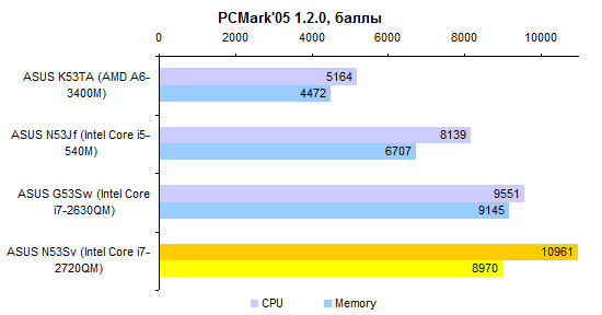 В протестированном ноутбуке был установлен один из самых мощных мобильных процессоров Intel — четырехъядерный Core i7-2720QM. Помимо весьма высоких частот (номинальная 2,2 ГГц, в режиме Turbo Boost до 3,3 ГГц) этот процессор примечателен тем, что в нем, в отличие от более популярного i7-2630QM, не отключена поддержка набора инструкций AES NI.  Однако в данном случае этот процессор может быть интересен только теоретически. Дело в том, что в продаваемые на российском рынке ноутбуки данной модели он не устанавливается. Вместо него используют либо двухъядерные ЦП семейств Core i3 и i5, либо младшую четырехъядерную модель Core i7-2630QM. Собственно, ноутбуки с процессором Core i7-2720QM вообще крайне редко встречаются в российской рознице. Этот чип можно обнаружить в основном в мобильных рабочих станциях. А также в 15- и 17-дюймовых «макбуках» и некоторых наиболее дорогих мультимедийно-пафосных и игровых моделях. Одним словом, портативный компьютер с 2720QM в России обойдется никак не меньше чем в 50 000 рублей. А вот оперативной памяти в тестовом экземпляре почему-то было установлено не слишком много — всего одна планка объемом 4 Гбайт. Разумеется, DDR3-1333 — максимально возможная для данной платформы память. Графическая система ASUS N53Sv состоит из двух адаптеров: интегрированного в процессор Intel HD 3000, в данной модификации работающего на частоте 1300 МГц, и внешнего NVIDIA GeForce GT 540M. За автоматическое переключение адаптеров отвечает технология NVIDIA Optimus. ⇡#Тестирование — производительность