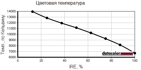 Также после калибровки была измерена зависимость цветовой температуры от уровня яркости при целевом значении 6500 K. Как видно на графике, при уменьшении яркости подсветки цветовая температура стремительно растёт, тем самым искажая реальные цвета.