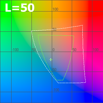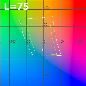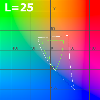 Для оценки цветового охвата использовался колориметр из комплекта Spyder3Studio. График цветового охвата строился для цветовой координатной системы Lab в координатах ab для светлости L=25, 50 и 75. На изображениях зелёная кривая — график цветового охвата дисплея тестируемого ноутбука, белая — стандартное цветовое пространство sRGB.