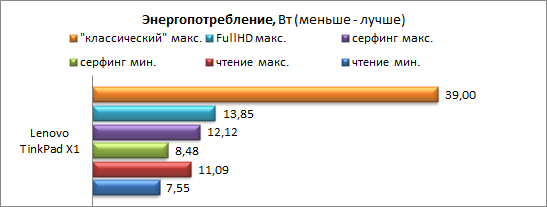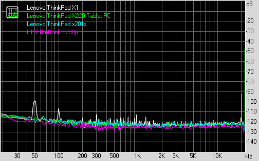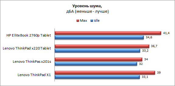 Ниже, для возможности сравнения с показателями героя материала, приведена сводная диаграмма уровня шума в режиме простоя и в режиме максимальной нагрузки. В качестве оппонентов были взяты LenovoThinkPad x201s, а также две «таблетки» — HP EliteBook 2760p Tablet и LenovoThinkPad X220 Tablet. Измерение уровня шума производилось на расстоянии 20 см от центра передней панели.