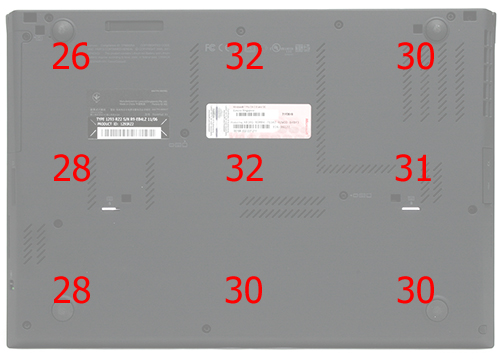 Замер уровня нагрева произволится при комнатной температуре (+21 градус Цельсия) для девяти точек днища и девяти точек рабочей области. После часового циклического запуска пакета 3DMark 2006 температура рабочей области в зависимости от точки измерения составила 28-30 градусов Цельсия, а днища — 26-32 градуса.