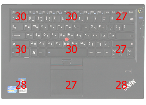 Клавиатура обладает защитой от жидкости — включая дренажные отверстия, через которые влага стекает под днище ноутбука. Кроме того, в ThinkPad X1 есть подсветка клавиатуры. Вместо привычного для пользователей «фонарика», подсвечивающего клавиши снаружи, теперь кнопки оборудованы внутренней подсветкой сиреневато-белого цвета с регулируемой яркостью.