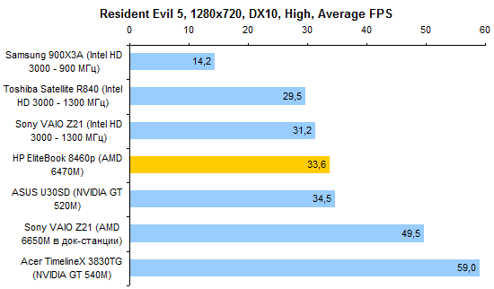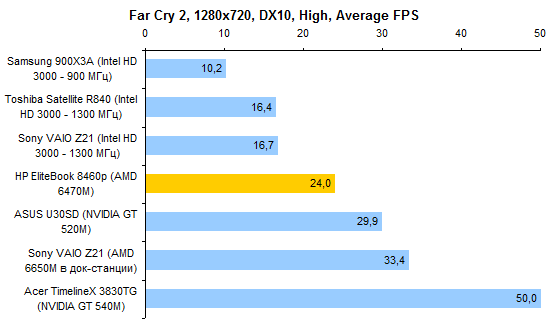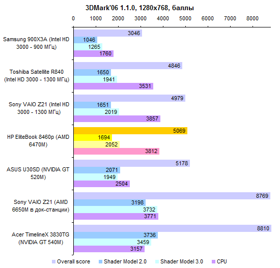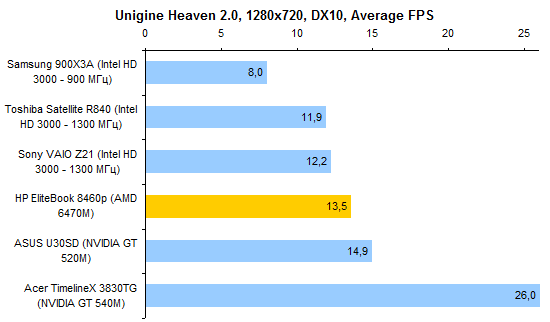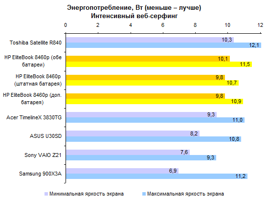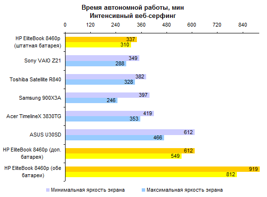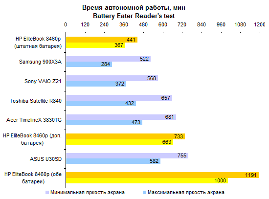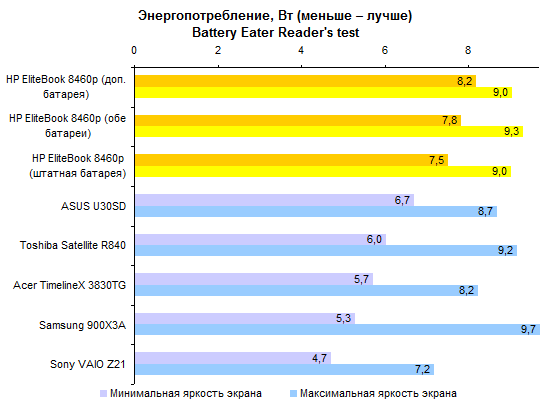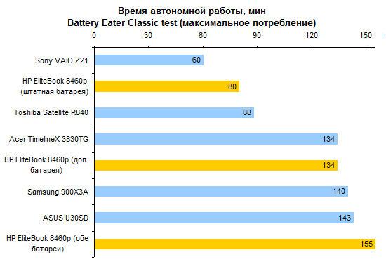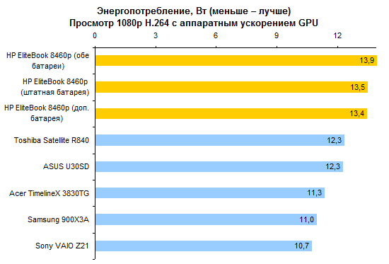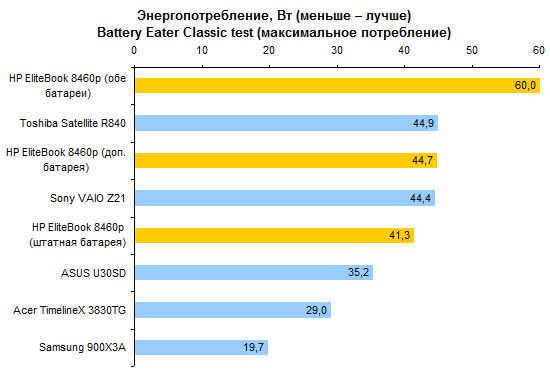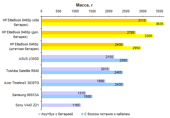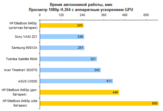 В протестированной конфигурации HP EliteBook 8460p был задействован старший двухъядерный процессор Intel для мобильных компьютеров — Core i7-2620M. Процессор действительно быстрый — прекрасный выбор для ноутбука, от которого требуется одновременно и серьезная производительность, и мобильность.  А вот графическая система, как уже было сказано выше, в HP EliteBook 8460p весьма неудачная. По скорости AMD Radeon 6470M недалеко ушел от интегрированного решения Intel.  Если уж хотелось добиться действительно серьезной производительности в графических приложениях, стоило использовать что-нибудь более мощное — хотя бы Radeon 6650M.     И в любом случае графику необходимо было сделать переключаемой. Впрочем, об этом поговорим подробнее через несколько абзацев. ⇡#Тестирование — масса, время автономной работыШтатный аккумулятор HP EliteBook 8460p отнюдь не поражает продвинутыми характеристиками. Он состоит из шести элементов питания, причем элементы далеко не самые емкие из тех, которые можно обнаружить в современных ноутбуках. Итоговая емкость — около 55 Вт*ч. Не то чтобы совсем уж мало, но от такой дорогой модели можно было ожидать большего. К нам на тест ноутбук попал с дополнительным аккумулятором весьма выдающейся емкости — 100 Вт*ч. Батарея крупная и довольно тяжелая, весит без малого 700 грамм. Крепится она под днищем. Вместе с внешним аккумулятором ноутбук выглядит прямо-таки угрожающе. Аккумулятор может заряжаться как от ноутбука, так и самостоятельно: на его корпусе есть разъем для подключения сетевого адаптера. И это удобно: можно оставить дополнительную батарею заряжаться в номере отеля и продолжать пользоваться ноутбуком как обычно. На корпусе дополнительного аккумулятора есть встроенный индикатор заряда. Работает он стандартным образом: после нажатия на кнопку уровень заряда высвечивается диодами. Если, как в данном случае, горит три диода из четырех — стало быть, в батарейке осталось около 75% заряда. Поскольку ноутбук оборудован дискретной графикой и довольно «горячим» процессором, его укомплектовали блоком питания мощностью 90 Вт — относительно крупным и не самым легким. Для HP уже стало традицией указывать в графе «масса» технических характеристик очень сильно заниженное значение. В данном случае это «2,07 килограмма». На самом деле даже без учета аккумулятора ноутбук весит немного больше. С батареей его масса оказывается в опасной близости от критической для 14-дюймового ноутбука отметки в 2,5 килограмма. Вместе с блоком питания выходит почти три кило. Ну а если захватить с собой еще и вторую батарею… В общем, мобильным этот ноутбук можно назвать лишь весьма условно. На заре эпохи ультрабуков HP EliteBook 8460p выглядит откровенным анахронизмом.  Неотключаемая внешняя графика от AMD серьезно вредит автономности в режимах с невысокой и средней нагрузкой — то есть именно в тех, которые обычно и востребованы при работе от аккумулятора.  Энергопотребление HP EliteBook 8460p оказывается выше, чем у всех ноутбуков, участвующих в сравнении. При этом 8460p вовсе не является самым производительным из них.  Если не использовать дополнительный аккумулятор, то ноутбук оказывается и наименее автономным из всех сравниваемых моделей.   Да, если использовать сразу два аккумулятора, то результат действительно впечатляет. Вот только в таком варианте EliteBook весит столько, что никакого желания ку