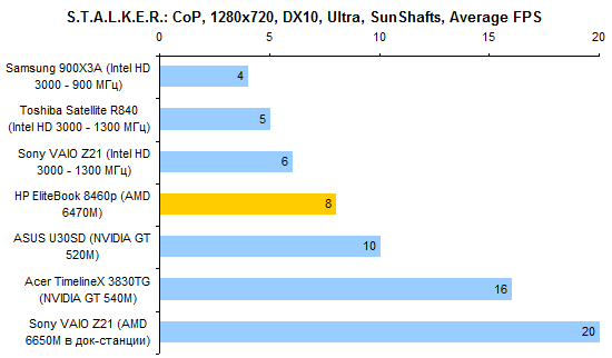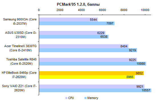 В протестированной конфигурации ноутбука был использован мощнейший двухъядерный процессор Intel для мобильных компьютеров — Core i7-2620M. Помимо высочайших частот, этот процессор отличается от некоторых других моделей наличием поддержки набора инструкций AES NI и увеличенным до 4 Мбайт объемом кеш-памяти третьего уровня. В менее дорогих конфигурациях можно обнаружить процессоры Core i5-2520M и 2540M. Эти ЦП также обладают поддержкой AES NI, весьма востребованной в корпоративном ноутбуке. Но частоты несколько ниже — 2,5/3,2 и 2,6/3,3 ГГц, а объем кеш-памяти стандартный для процессоров Core — 3 Мбайт. Графическая система HP EliteBook 8460p — пожалуй, главный недостаток этого ноутбука. Все дело в том, что здесь использован один из младших видеоадаптеров AMD, причем возможность переключения на интегрированную графику не предусмотрена. В итоге энергопотребление оставляет желать лучшего, при этом производительность в 3D-приложениях не такая уж высокая.  В принципе, есть конфигурации EliteBook 8460p с интегрированным графическим адаптером, без внешнего. Но проблема в том, что к ним автоматически прилагается процессор Core i5 вместо i7 и, что более критично, дисплей с разрешением 1366х768 вместо 1600х900. Хорошая новость состоит в том, что экран в любом случае будет матовым — матрицы с глянцевым покрытием для данного ноутбука попросту недоступны. Еще один элемент, который встречается только в старших конфигурациях, — SSD. HP использует твердотельные накопители производства Micron — из серии RealSSD C300. Объем невелик, всего 128 Гбайт. Да и обойдется он весьма недешево: порядка 12 000 рублей. Более прозаические конфигурации комплектуются традиционным жесткими дисками на 320 или 500 Гбайт — со скоростью вращения шпинделя 7200 об./мин и системой защиты на основе акселерометра. Что до сетевых интерфейсов, то с ними у ноутбука все однозначно хорошо. Есть и Wi-Fi с поддержкой 802.11b/g/n, и Bluetooth, и гигабитный адаптер проводной сети. Примерно в половине конфигураций также доступен 3G-адаптер производства Ericsson. Интересно устроена система крепления крышки отсека, содержащего заменяемые компоненты. Металлическая панель крепится не на винты, а на защелки. Крепится хорошо и надежно — не болтается и уж тем более не выпадает самопроизвольно. Чтобы освободить днище, надо воспользоваться задвижкой, расположенной справа от разъема дополнительного аккумулятора (левая задвижка отвечает за основную батарею). После этого открывается доступ ко всем заменяемым компонентам системы — от памяти до процессора. Интересно, что жесткий диск расположен не прямо у днища, а чуть в глубине. Между винчестером и металлической крышкой есть дополнительная прокладка, помогающая уберечь накопитель в случае серьезных механических воздействий. Ею служит откидывающееся устройство чтения Smart Card. ⇡#Тестирование — производительность